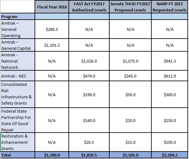 [The Senate THUD FY2017 Proposed Levels bill summary identified $334 million for Rail Safety & Research Programs, not completely accounted for in this table; the total funding level identified by the Committee is $1.7 billion.]