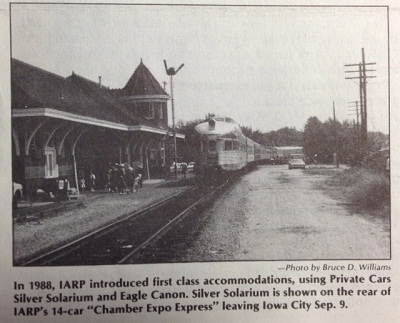 Also from June 1989: The Iowa Association of Railroad Passengers (IARP) at that time cooperated with sports teams and convention promoters in the state to operate special passenger trains over Iowa Interstate Railroad (ex-Rock Island) lines, like the one pictured leaving Iowa City on Sept. 9, 1988 with luxury private cars on the rear (see photo). The Executive Vice President of IAIS, which is owned by long-time NARP member Henry Posner, III, at the time said “Part of being a good corporate neighbor, as far as interaction with the public is concerned, is the operation of passenger trains for excursion purposes.” It would be nice if more railroads had that attitude.