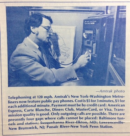 July 1986: Amtrak introduces “Railfone,” on-board public pay phones on New York-Washington Metroliners (predecessors to today’s Acela whose equipment, designed in the 1960s, is the model for the still-ubiquitous Amfleet). How times have changed: