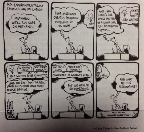 June 1989: File under missed opportunities: Reauthorization of the federal Clean Air Act that year could have emphasized “reduced auto use and increased reliance on mass transit and transit-supportive land use planning.” Yet then-President George H.W. Bush’s clean air plan only called for individual cars to emit fewer pollutants, not for the still-needed shift away from car overdependence. The cartoon below by Tom Toles (now with the Washington Post) says it all. Many clean air advocates at that point were calling for increasing transit use to be an integral component of the federal strategy to reduce air pollution. While some progress has been made since then (such as the Congestion Mitigation and Air Quality program for which passenger train and rail transit projects are eligible), the connection between our travel choices and the air we breathe still hasn’t been fully ingrained in public policy.