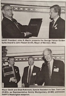 NARP presented our Golden Spike Award to John Robert Smith, then Mayor of Meridian, MS (R). He is now vice chairman at the national advocacy coalition Transportation for America (of which NARP is a member), and still testifying to the power of passenger train service to foster economic development in small to mid-sized cities and towns, even those (like Meridian) served by one train a day in each direction. Here’s part of what he said in his inspiring April 27, 1995 acceptance speech: