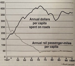 It’s more of a “chicken-and-egg” situation—which came first, passengers abandoning trains, or government building roads for them to drive on instead? At right is a chart drawn from the Federal Highway Administration and other sources. It shows a clear, inverse relation between highway spending (all levels of government, adjusted for inflation) and passenger train use (intercity and commuter).