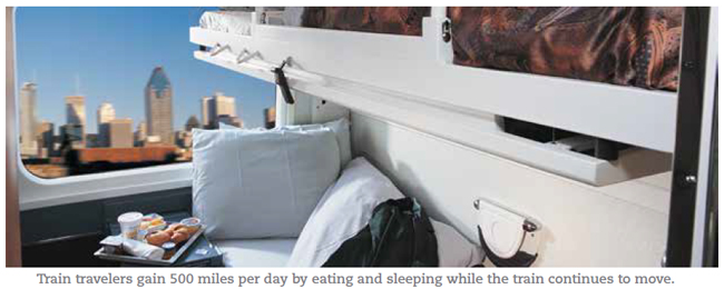 When properly configured, trains can be time competitive with driving, especially as trip length increases. On trips over 500 miles, most drivers will take breaks for meals and rest that add significantly to trip time. To save time and money, some drivers deliberately skip such breaks. Fatigue, stress, monotony and other factors, however, begin to compromise their ability to operate their vehicle safely, endangering not only themselves and any passengers in their vehicles but also others on the road. The longer the trip, the greater the danger of driving straight through becomes. People on a train, however, move safely while they eat and sleep. They can cover an additional 500 miles or more per day without stress, discomfort or danger to others.