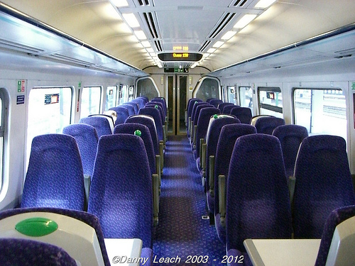 Interior of a ScotRail FSC 158733 diesel multiple unit train car.