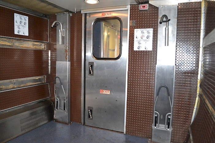 On today’s eastbound Capitol Limited (yesterday evening’s Chicago departure), Amtrak conducted its first over-the-road test of vertically-mounted bicycle restraints installed in the lower-level baggage area of one Superliner coach. This represented the first time unboxed bikes were carried on a Superliner-equipped train since they were carried on the Cardinalbefore the train was re-equipped with single-level cars in 2002.