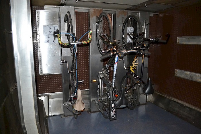 Passengers' bicycles secured in the lower-level baggage area of a Superliner coach.