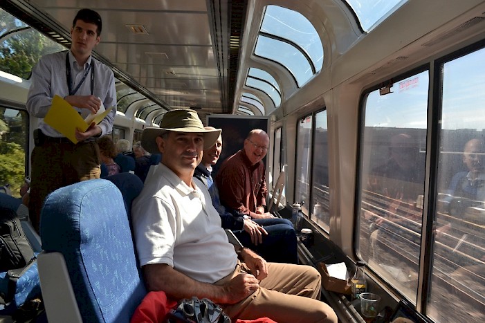 Members of the Virginia Bicycling Federation, who brought their bikes onboard at Harpers Ferry, WV for the trail, relax in the Capitol Limited's Sightseer Lounge car.