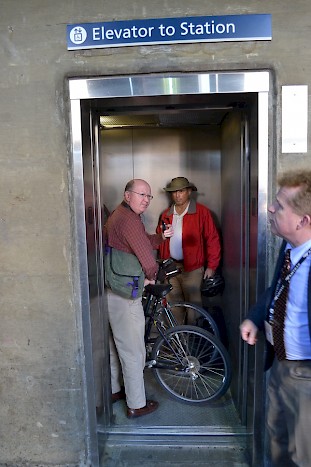 Trial participants take their bikes on the platform elevator into the station at Washington.