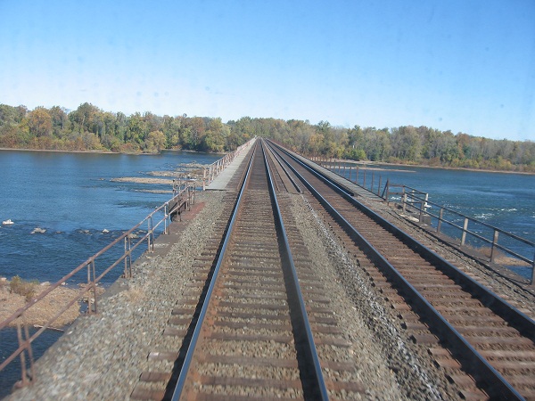 Crossing the Susquehanna River on the Rockville Bridge between Summerdale and Harrisburg, PA. While this is part of the Pennsylvanian's regular route, the Autumn Express stopped atop this bridge for 5 minutes for photos. Photo by Ross Capon.